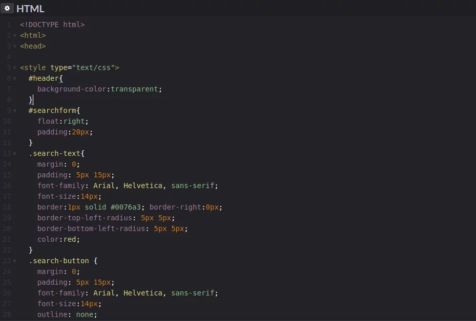<!DOCTYPE html> <html> <head> <style type="text/css"> #header{ background-color:transparent; } #searchform{ float:right; padding:20px; } .search-text{ margin: 0; padding: 5px 15px; font-family: Arial, Helvetica, sans-serif; font-size:14px; border:1px solid #0076a3; border-right:0px; border-top-left-radius: 5px 5px; border-bottom-left-radius: 5px 5px; color:red; } .search-button { margin: 0; padding: 5px 15px; font-family: Arial, Helvetica, sans-serif; font-size:14px; outline: none; cursor: pointer; text-align: center; text-decoration: none; color: #ffffff; border:1px solid orange; background: orange; border-top-right-radius: 5px 5px; border-bottom-right-radius: 5px 5px; } .search-button:hover { text-decoration: none; background: #007ead; } /* Fixes submit button height problem in Firefox */ .search-button::-moz-focus-inner { border: 0; } .clear{ clear:both; } </style> </head> <body> <!-- HTML for SEARCH BAR --> <div id="header"> <form id="searchform" method="get" action="http://www.google.com"> <input type="text" class="search-text" name="q" size="21" maxlength="120"><input type="submit" value="🔍" class="search-button"> </form> <div class="clear"></div> </div> </body> </html> - You can edit the positioning by editing the search form code .