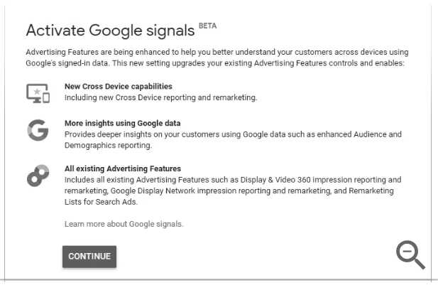 - Read the information about Google signals, then click CONTINUE.