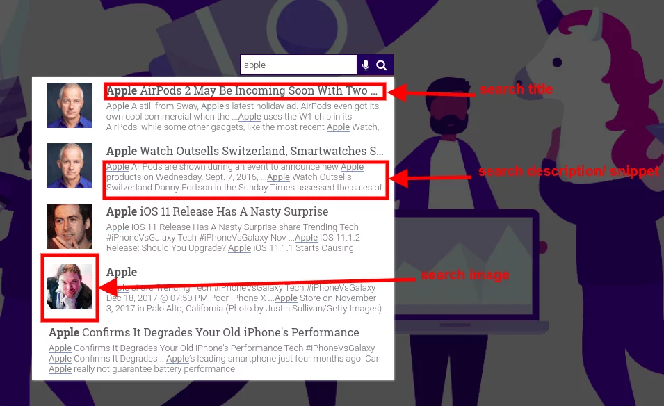 When you create a custom search engine using expertrec, the crawler extracts content from the page to show in the search result title and description.