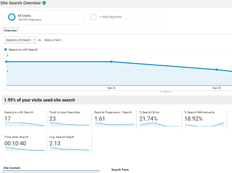 - Within a couple of days you will be able to see your site search stats by going to Behavior->site-search-> overview (or) search terms